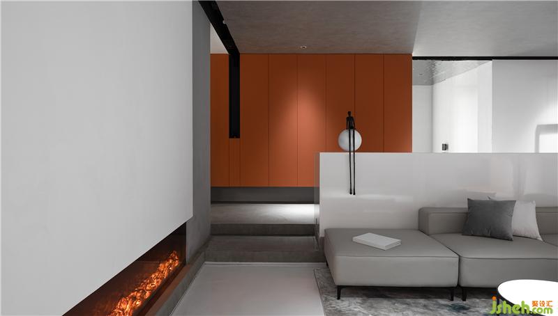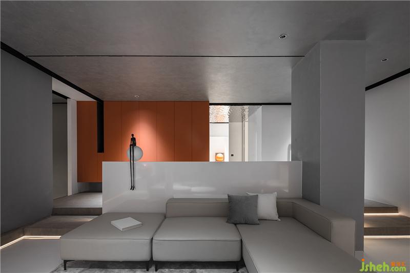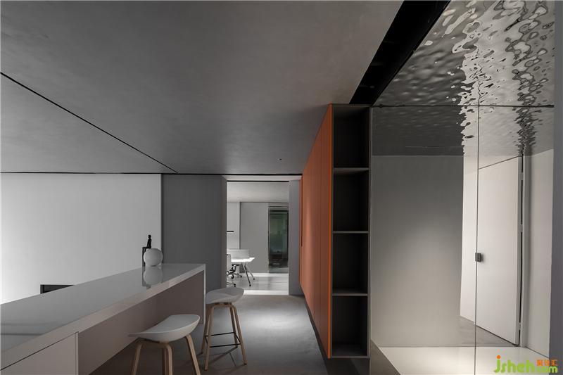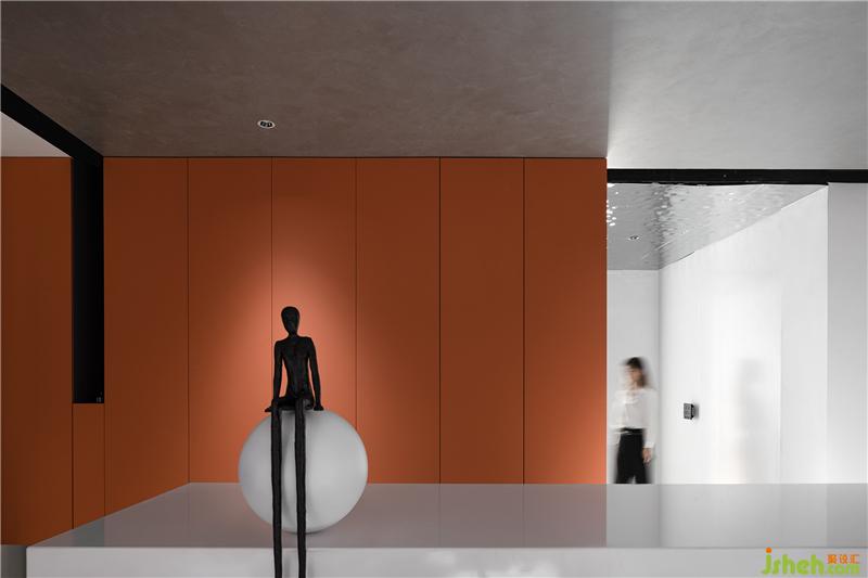 吧臺(tái)處望過(guò)去,橙色支點(diǎn)裝置藏于一隅,俏皮而恰好,將規(guī)整的幾何空間打破,讓氣氛變得活潑。