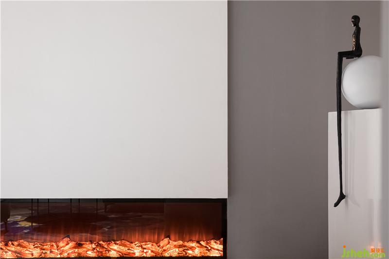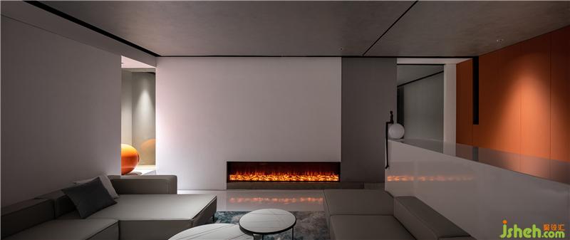 呼應(yīng)會(huì)客區(qū),吧臺(tái)通道進(jìn)行了抬升設(shè)計(jì),使整體辦公設(shè)計(jì)空間呈現(xiàn)起伏與變化。拾級(jí)而上通往總監(jiān)辦公室。廊道之上,波紋板天花營(yíng)造出波光粼粼的水倒影效果,與壁爐騰起的火焰輝映成趣。