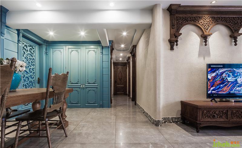 客廳和餐廳完全開(kāi)放的設(shè)定,從比較壓縮的玄關(guān)空間轉(zhuǎn)換到開(kāi)放寬敞的空間,達(dá)到視覺(jué)和心境的轉(zhuǎn)換??蛷d作為待客區(qū)域,墻面通過(guò)使用木飾面、仿舊肌理裝飾,地板鋪貼巴黎世家仿古瓷磚,搭配歐式復(fù)古家具,整體空間簡(jiǎn)潔懷舊、實(shí)用舒適,寬敞而富有歷史氣息。