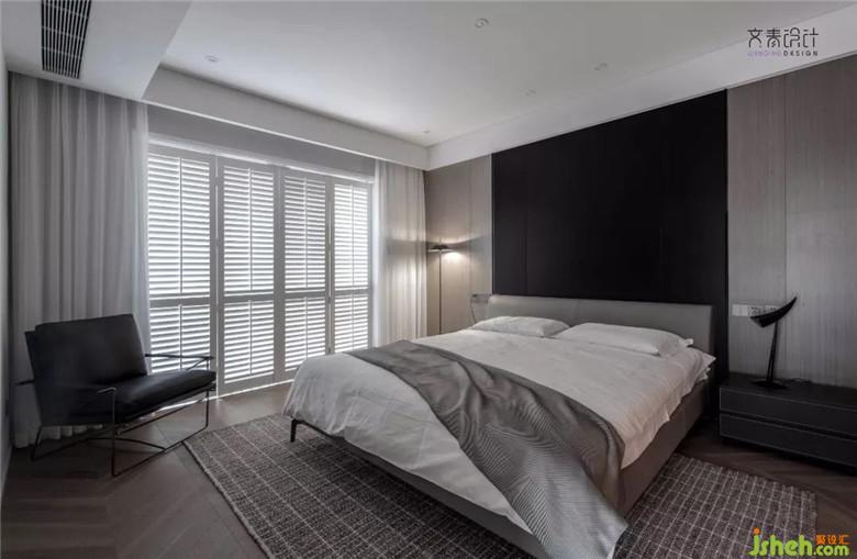 黑色床頭背景和單人椅子呼應(yīng),百葉格柵也能讓進(jìn)戶的光線更加柔和。