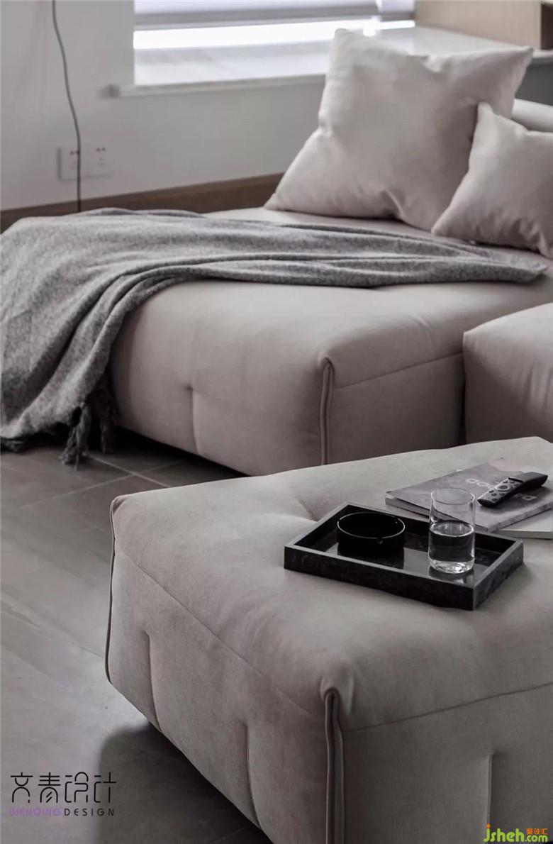 主是個十足的游戲控,除了安裝完現(xiàn)有的游戲設(shè)備還有掌機(jī)外,他還想買個體感游戲設(shè)備。因此,設(shè)計(jì)師除了將客廳范圍面積擴(kuò)大之外,沙發(fā)選用了移動輕便模塊式沙發(fā)。這種沙發(fā)高度沒有普通沙發(fā)那么高,成人可以站坐在沙發(fā)背上。