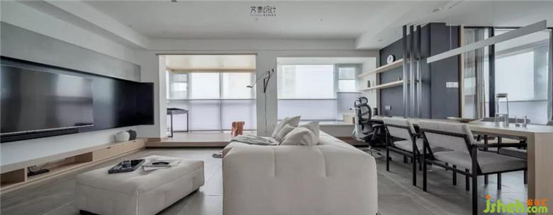 將客廳處的陽臺內(nèi)包,用抬高層來與客廳做區(qū)域隔斷。在這里,他可以在陽光中做些簡單的文字工作,閱讀等。