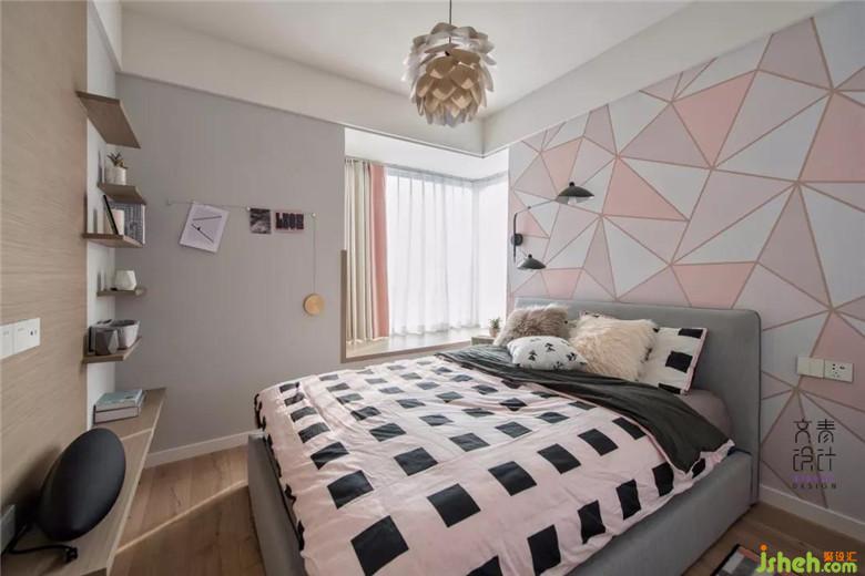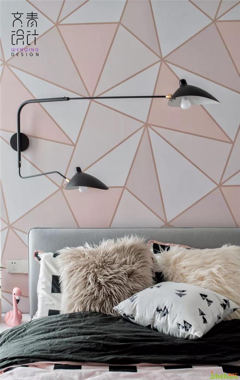 床頭貼上的粉色三角逅舍墻紙讓臥室眼前一亮,淡淡的透露著雅痞的不羈,讓人不由得想探求,此中掩藏的魅惑;不規(guī)則搭配著左側(cè)的鴨嘴雙壁燈,靈動(dòng)之處又消減了一絲濃重,相對勾勒出一點(diǎn)俏皮感和青春感,呈現(xiàn)了如主人般知性優(yōu)雅的氣質(zhì)。