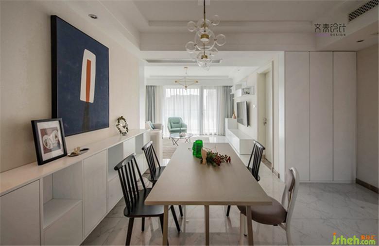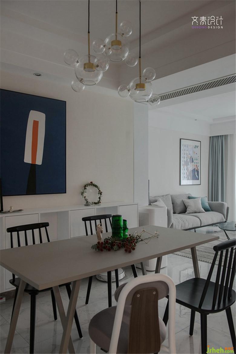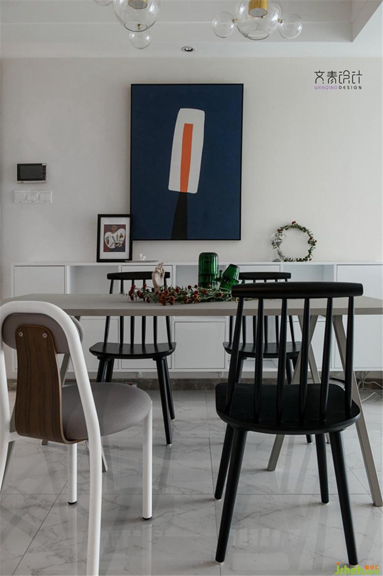 由于硬裝上沒有做改動,因此在家具、窗簾盒裝飾畫的選擇上,加入多色系的元素。顏色選擇上多用莫蘭蒂色調(diào),整體的飽和度還是偏低的,這樣整體感覺會更融洽。