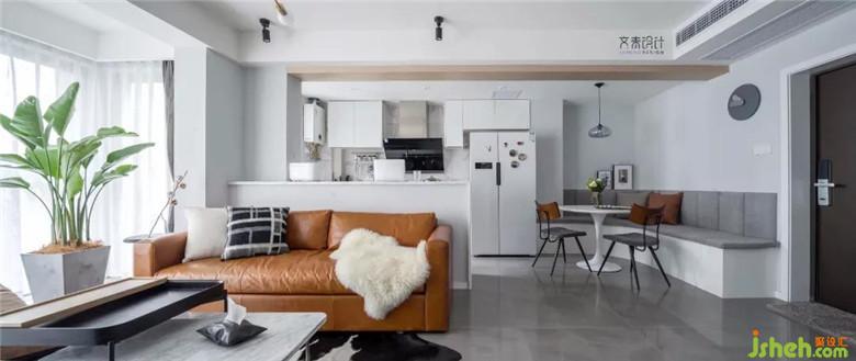 客廳處將廚房墻推倒,陽(yáng)臺(tái)內(nèi)包,原本規(guī)整局促的客廳就開闊許多??蛷d望向沙發(fā)、吧臺(tái)、櫥柜,視覺錯(cuò)落,層次分明。