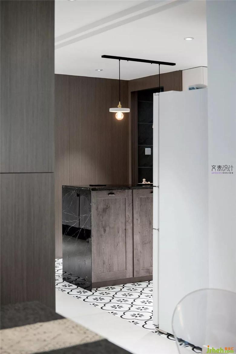 現(xiàn)吧臺位置原是一堵隔墻,推倒做吧臺后雖增加了儀式感,但因為格局限制,吧臺旁就是衛(wèi)生間,這里就用了大塊木飾面將其隱藏。