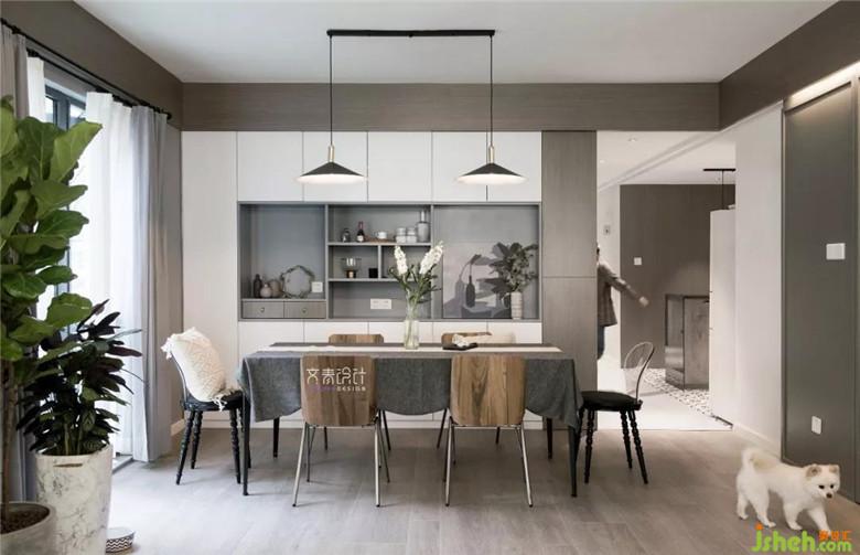 餐廳一側(cè)做大塊面的開放柜,擺上用餐佐料,餐具,小裝飾品,就是繽紛的小景。所以避免視野過亂,燈具選擇取向就得簡單。