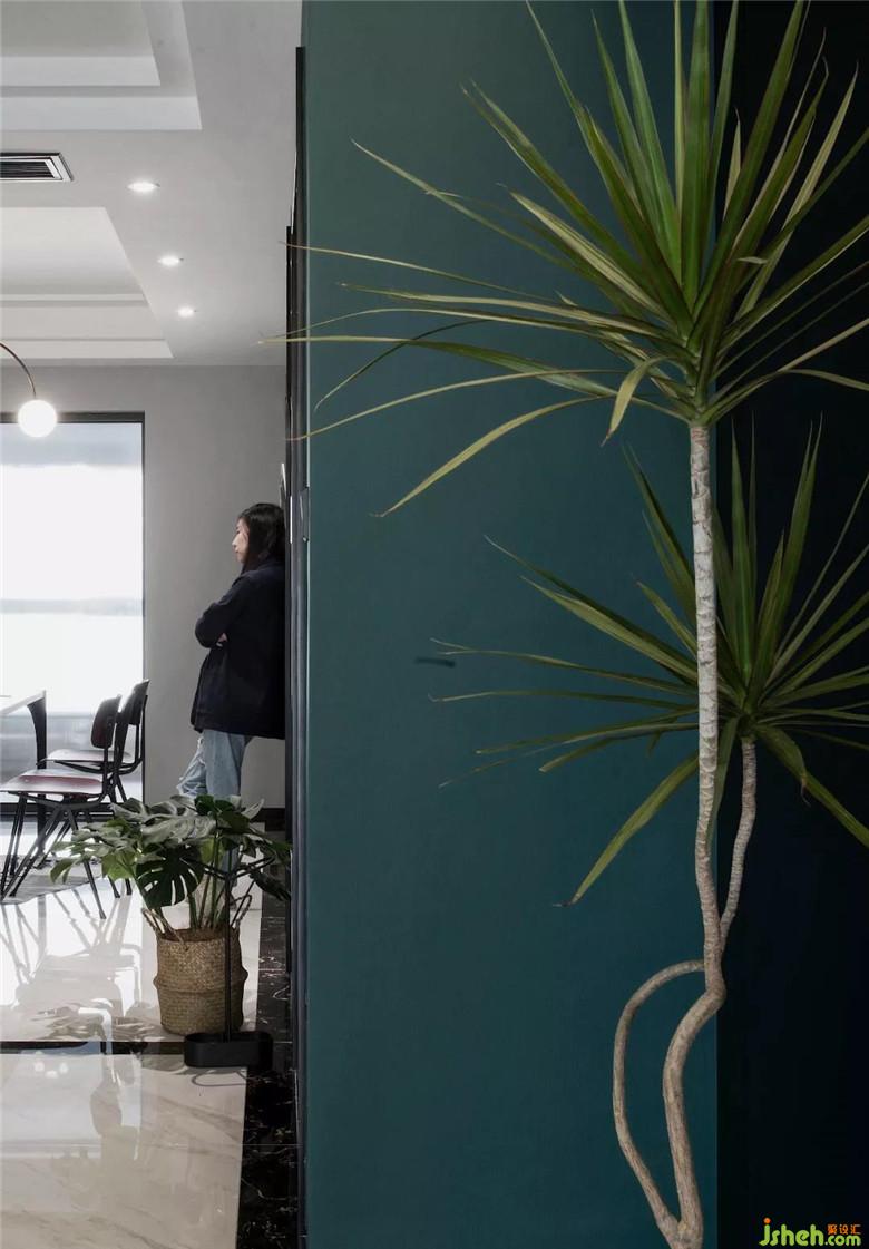 一大長條餐邊柜,收納不愁。森系配色,和另一邊的圣誕綠墻非常搭。