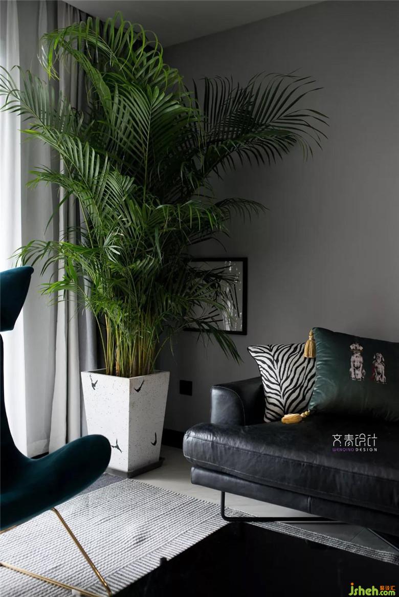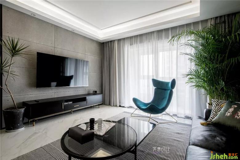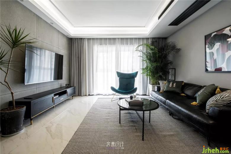 電視背景墻是原硬裝做的防水泥板墻,問題不大就沒做改動??蛷d空間整體搭配比較利落大氣,同時輔以綠植,掛畫,家具跳色細(xì)節(jié)點綴。