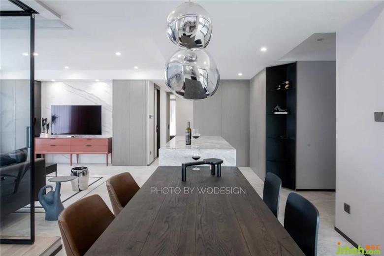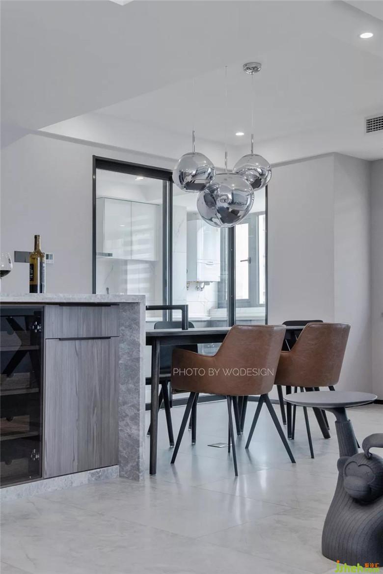 按常規(guī)設(shè)計來說,中導一般設(shè)計在廚房附近。這里將中導做在入戶門口其實另有深意。女業(yè)主不喜歡一進家門就一眼望盡空曠的客廳,這樣令她沒有安全感。也不喜做一個能阻擋全部視野的入戶門廳。而且這個中導里是一個容量較大的酒柜,使用起來十分方便。