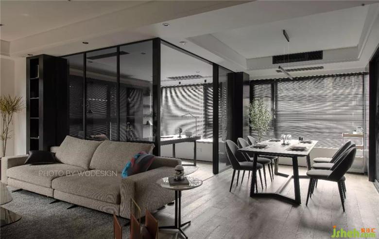 呂先生在和設(shè)計(jì)師對方案之初,就有把書房留作兒童房之用,因此電源留口都是臥室的配置。但近幾年這里做臥室的話,稍顯浪費(fèi)。因此,將兩面墻體都推倒,用黑玻作隔斷,保證一定的隱私性,空間質(zhì)感也很棒。半開放書柜,開放部分留出作擺件展示,另一部分用作藏書,十分實(shí)用。