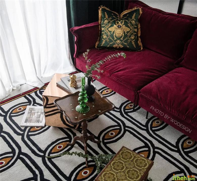 業(yè)主是非常不喜歡網(wǎng)紅爆款家具的。很多家具都是她照著設(shè)計師給的圖樣風格,自己花了比較多的功夫去淘的。就比如上圖的方形小凳,這是她在西班牙路邊的一家古著家具店淘到,同時地毯和抱枕也都選用了較為復古的款式和紋路。