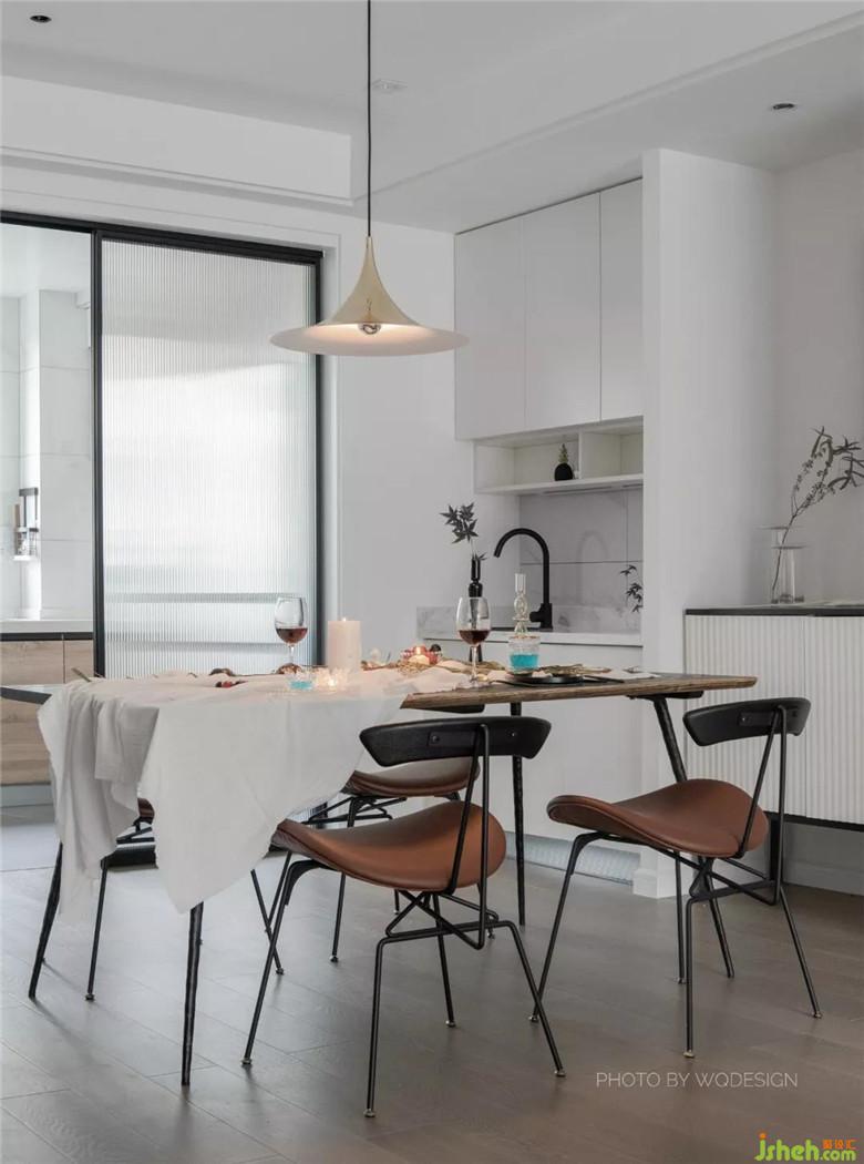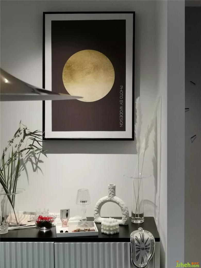 餐廳一側(cè)用實(shí)墻隔出兩個開放小隔間,一邊兒做水吧臺,分擔(dān)廚房的部分功能,一邊兒擺上餐邊柜,作收納置物的功能,造型也比較好看。