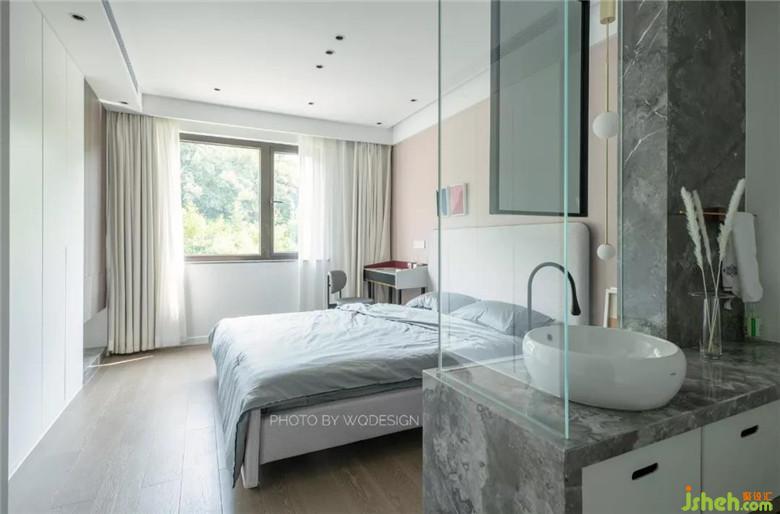 這套房改動最大的就是主臥區(qū)域了。原主臥是尋常的一臥一內(nèi)衛(wèi)的格局,這里將干區(qū)設(shè)計(jì)在原過道區(qū),床頭朝向就可以順應(yīng)傳統(tǒng),也將洗浴區(qū)和如廁區(qū)分離開來,一同使用也不會尷尬。