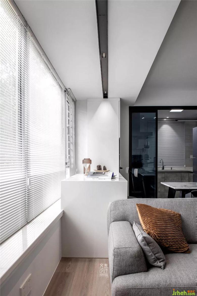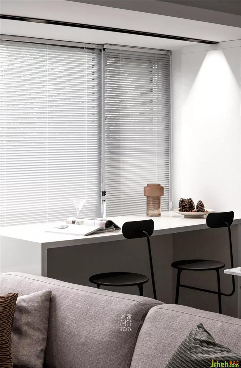 位于餐廳邊的定制書桌,很好地詮釋了功能性。朝南,用百葉簾來控制進光,適合晨起閱讀。下廚、準備就餐時,也能當做導臺使用。