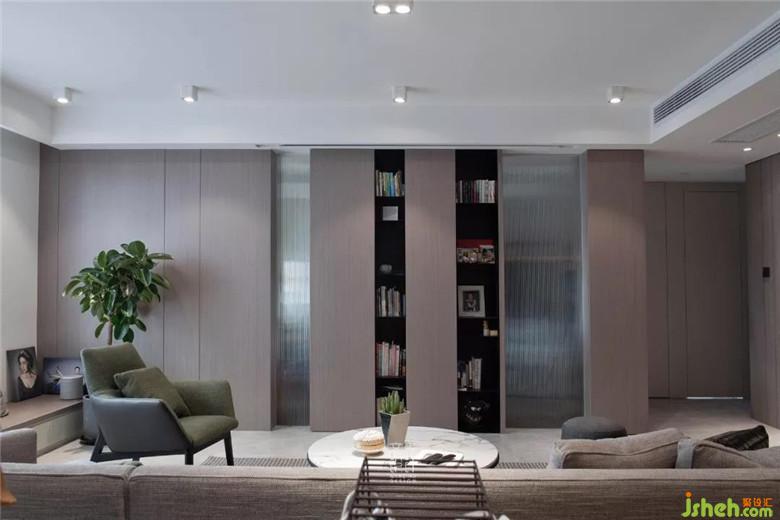 書(shū)柜一半是隱形的,一半是露在外面的。簡(jiǎn)單簡(jiǎn)潔的呈現(xiàn)外面,零碎的收納到里面。