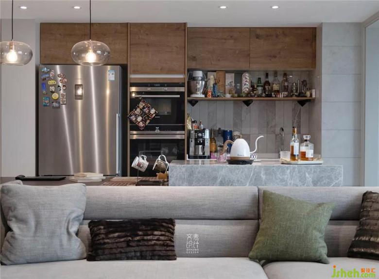 水吧臺(tái)分擔(dān)出廚房的一大部分功能,裝修公司規(guī)劃好的櫥柜也正好用來(lái)擺放業(yè)主旅游套來(lái)的飲品。