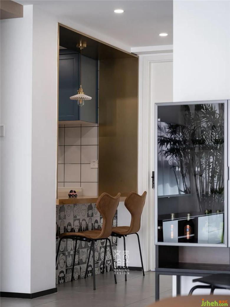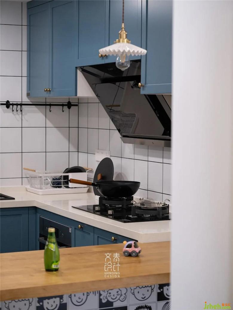 廚房色彩同樣是呼應(yīng)客廳的湖藍(lán)色,同時(shí)融入一些金屬元素造型,規(guī)避了硬裝改造后的暴露出的錯(cuò)亂的橫梁、管道。