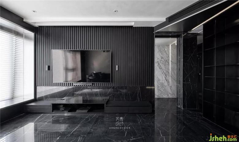 電視背景墻,黑色木頭材質(zhì)的欄珊,結(jié)合黑色大理石拼湊出層次感