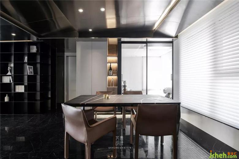 進(jìn)門后看到的第一個(gè)區(qū)域是餐廳,咖色餐椅、不銹鋼和黑色大理石材質(zhì)的餐桌,裝修公司讓空間黑色和金屬元素進(jìn)行到底。餐廳吊頂也是不銹鋼材質(zhì)吊頂,鋼本色。