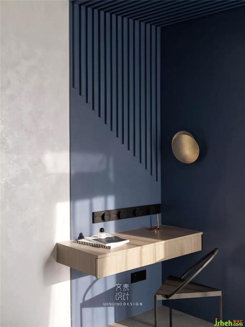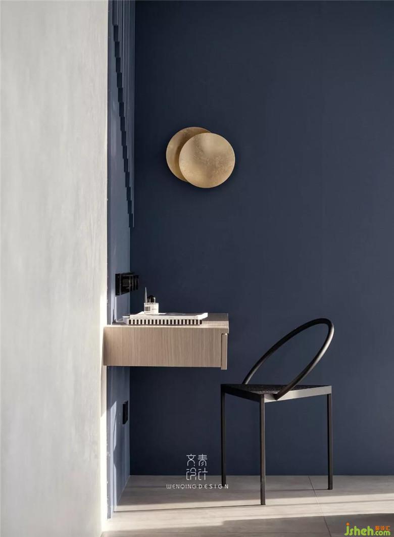 與公共區(qū)域不同的,主臥作為休憩的地方,色彩和材質(zhì)都溫和許多。房內(nèi)唯一的顏色就是海藍,這樣的色彩給予人以靜謐和曠達的心情。