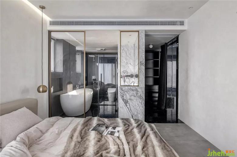 主臥內(nèi)衛(wèi)干濕分離,干區(qū)用玻璃隔斷,視野通透,但也不必害羞,單身貴族的快樂你可以懂。