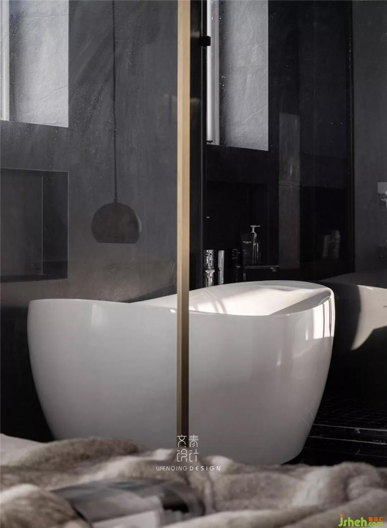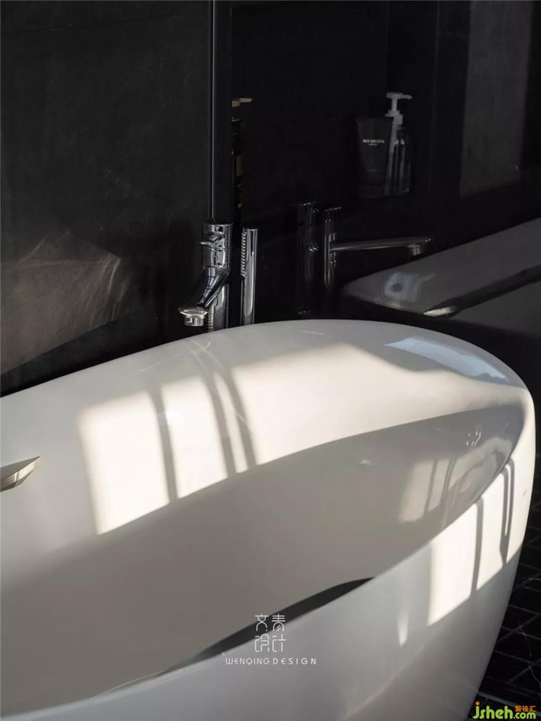 面積足夠的衛(wèi)生間,一個舒適的大浴缸是少不了的,黑白搭配的色系,大理石和瓷磚特別融洽。
