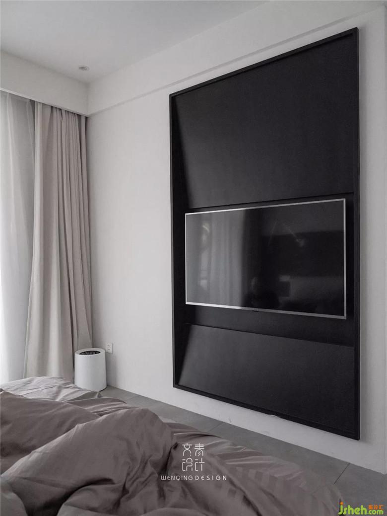 次臥電視背景墻。幾何梯型和餐廳玄關(guān)公共空間的吊頂相呼應(yīng)。也表達(dá)了一種設(shè)計(jì)的延續(xù)性。臥房里的黑使用的比較克制。