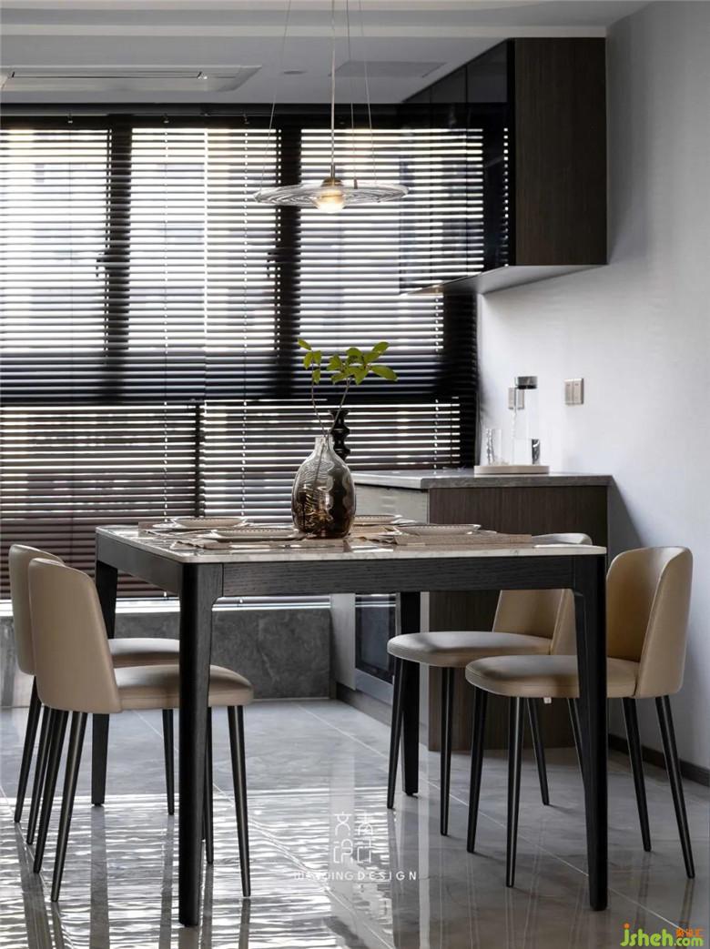 餐廳也有標配的陽臺,本著不浪費每一寸自然光的原則,裝修公司采用了有著“光影魔術(shù)手”之稱的百葉簾,業(yè)主有時會在餐桌上辦公,陽臺的矮柜就成了“辦公區(qū)”最好的水吧臺。