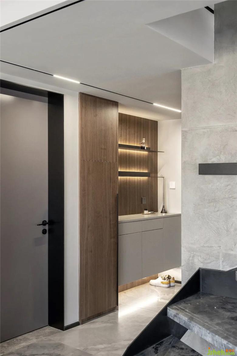 裝修公司在玄關(guān)處為未來女主人做了一些小細(xì)節(jié),鞋柜一側(cè)單獨(dú)留了較高的空間用來放靴子,底部抬高的部分也按照女士短靴高度來設(shè)計,不得不說,小金為未來女主人是真上心。