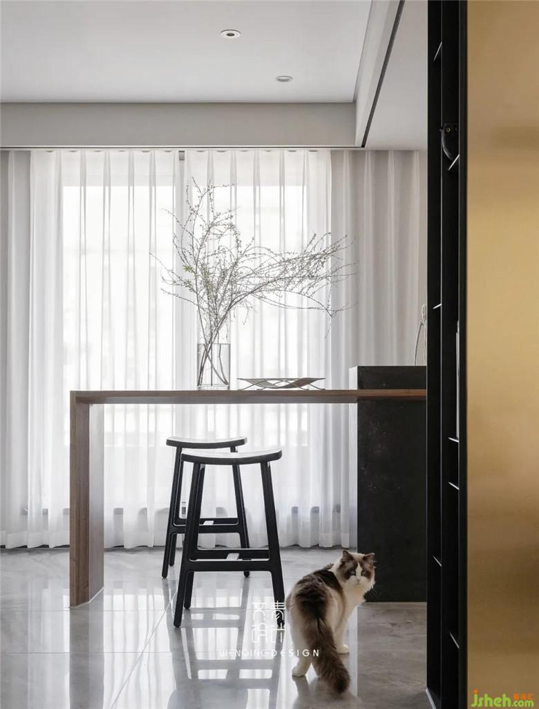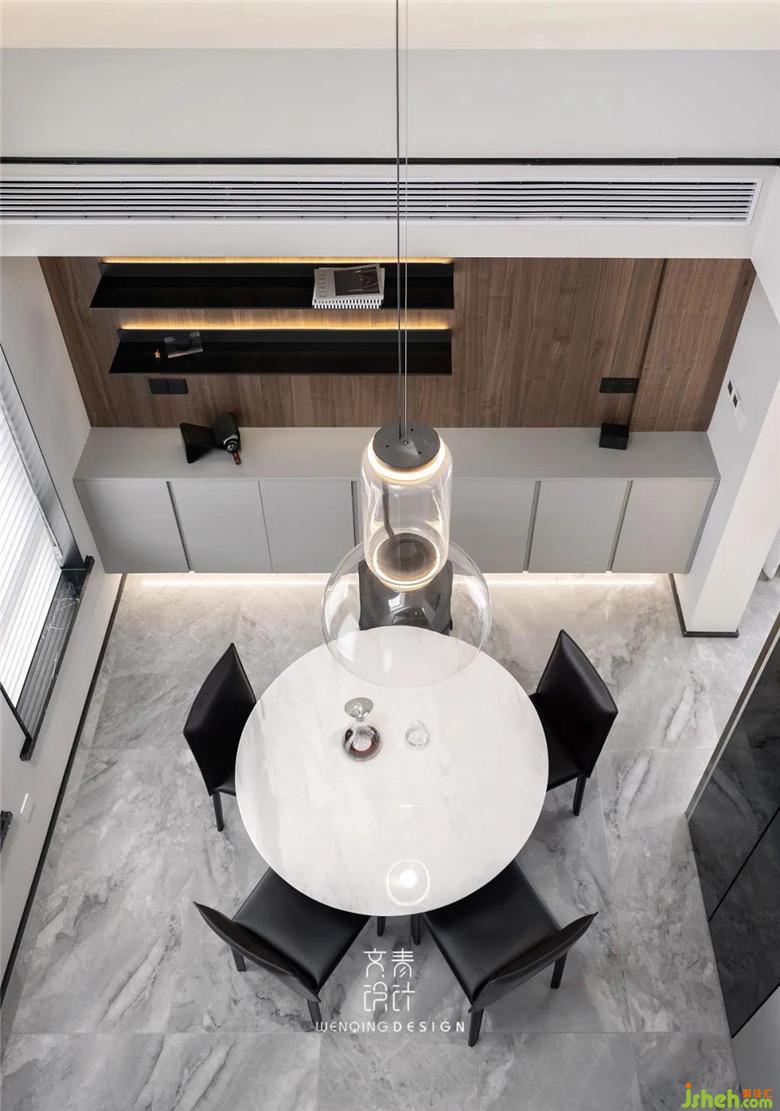 餐廳與客廳之間只用了電視背景墻來簡單隔斷,廚房裝修公司也采用了窄框玻璃門,將線條與簡約貫穿了整個一樓空間,吧臺的設(shè)計使得一個人在家用餐時也不會覺得那么空曠,反而多么一絲隨性。