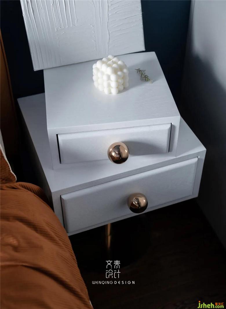 床頭為十一專門定制了梳妝臺,給生活小小的儀式感,床頭柜也采用梳妝盒造型,小首飾和日常物品也能有分類。