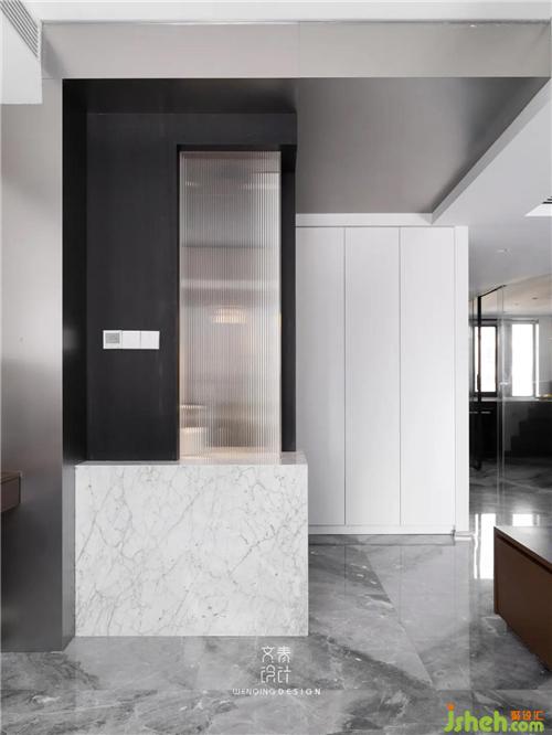 書房旁的公衛(wèi)采用不銹鋼吊頂,獨(dú)樹一幟的設(shè)計(jì),往往能讓人眼前一亮,不銹鋼材質(zhì)從頂延伸至墻面,與木飾面、玻璃和大理石形成材質(zhì)反差,讓視覺直觀體驗(yàn)到設(shè)計(jì)的碰撞感。