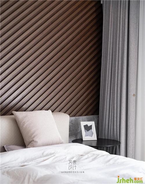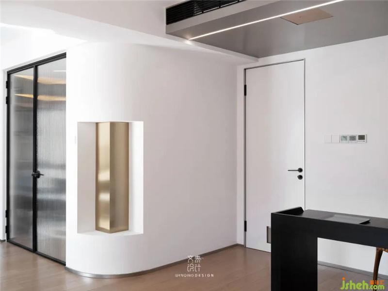 主臥進(jìn)門處吊頂延續(xù)不銹鋼材質(zhì),門框、踢腳線也運(yùn)用相同材質(zhì)延伸,營(yíng)造設(shè)計(jì)延展統(tǒng)一性。轉(zhuǎn)角處的直墻采用圓角處理,減弱直墻硬朗線條的沖突感,中部鏤空嵌入金屬裝置,用剛?cè)岵?jì)四字形容足以。