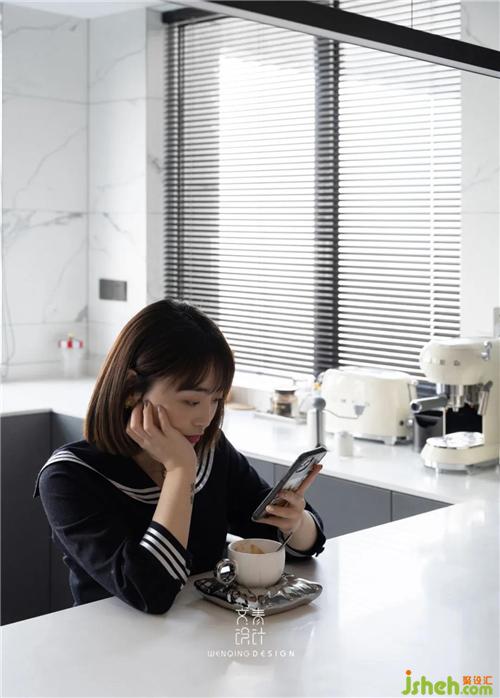 原本入戶是局促的廚房空間,我們敲掉廚房與書房的隔墻,做成開放式餐廚空間,這樣廚房就能擁有三面窗,擴(kuò)大使用空間和采光面積杭州裝修設(shè)計(jì)。