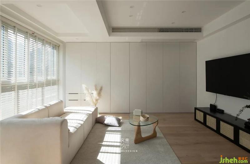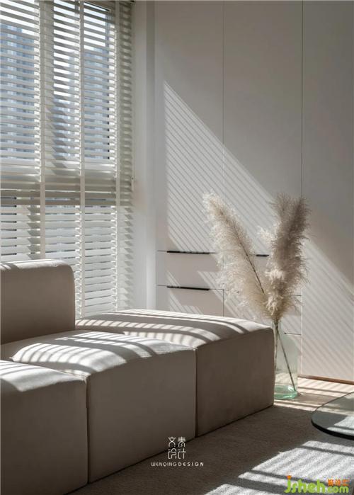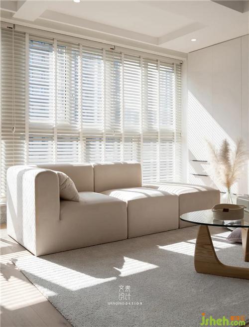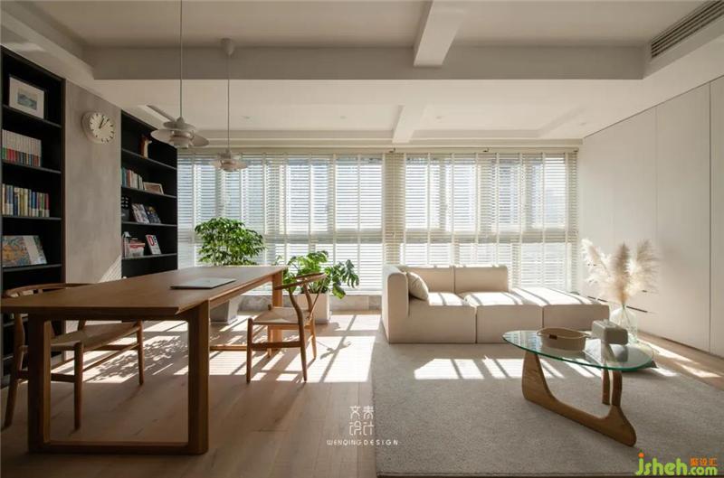 進門右轉即是全開放式的起居空間,借助戶型優(yōu)勢,客廳有著一整排大大的落地窗,在家中直接面對窗外的混凝土叢林過于冰冷,杭州裝修設計用百葉簾將窗景進行分割,能進入家中的,都是經過篩選的好風景。