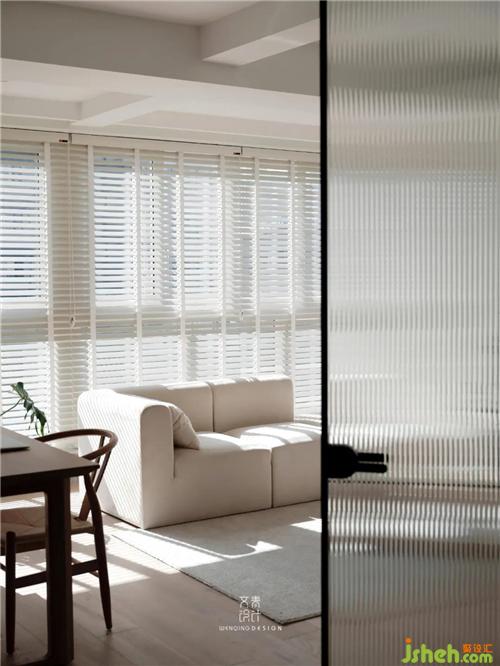 通往客廳的過道中藏了一小間儲物室,靠客廳外側選用長虹玻璃做為房門與墻體,當儲物室打開時,在全開放式的空間中又多一道隔斷。
