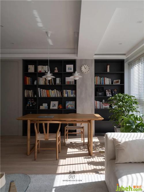 客廳另一側(cè)則改造成家中的開(kāi)放式書(shū)房,我們將墻體往主臥內(nèi)推,定制內(nèi)嵌式開(kāi)放書(shū)柜,原本突兀的承重柱,剛好切斷滿墻書(shū)柜的壓抑感,創(chuàng)造了視覺(jué)上的呼吸點(diǎn)。