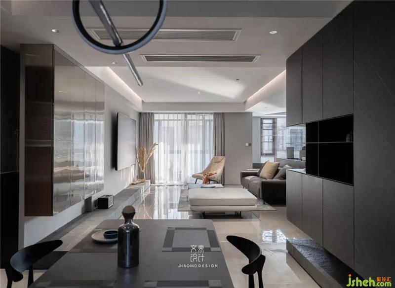入戶鞋柜作為空間視覺轉折點,讓空間之間的過渡更柔和??紤]到餐廳的采光,運用百葉簾對光線的折射,營造光學美感。