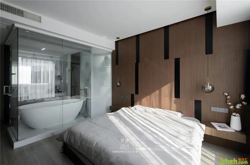 主臥延續(xù)木飾面背景設計,柔和的底色給人舒緩之感,設計風格鮮明的主衛(wèi)和綠植景觀,與柔和的底色形成鮮明的視覺反差,也成了臥室中的點睛之筆杭州裝修設公司。