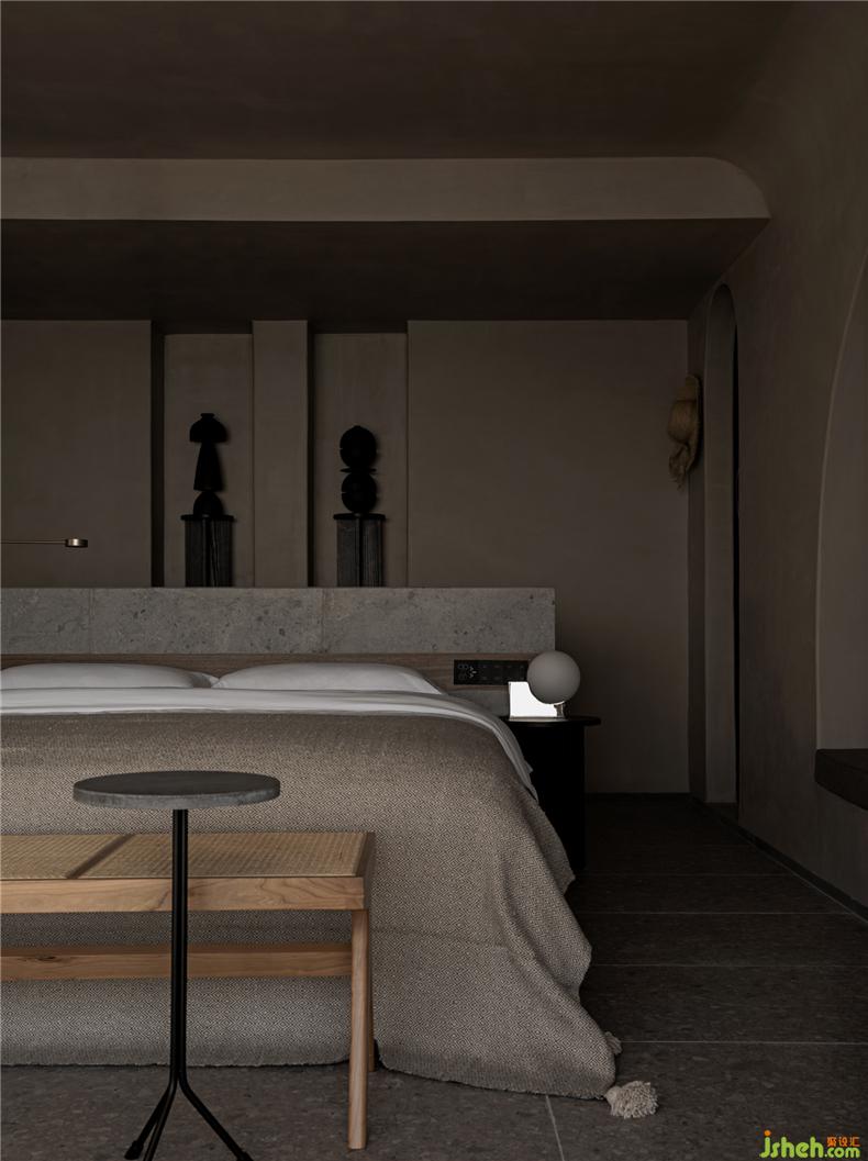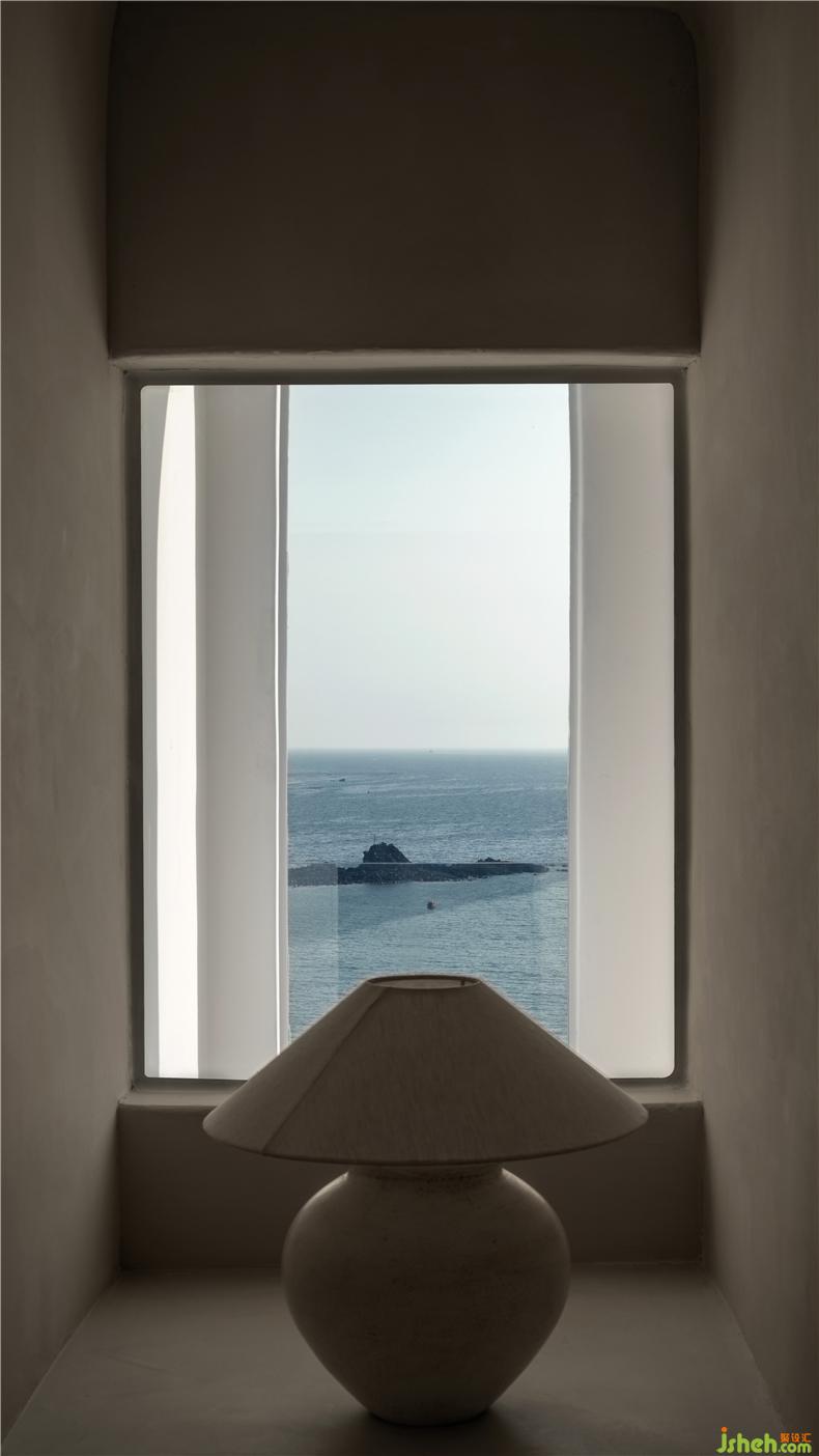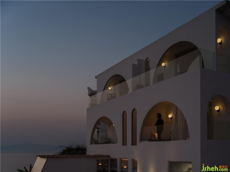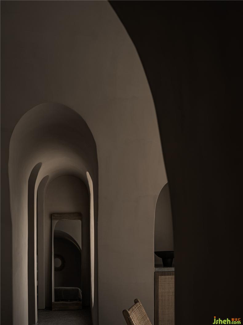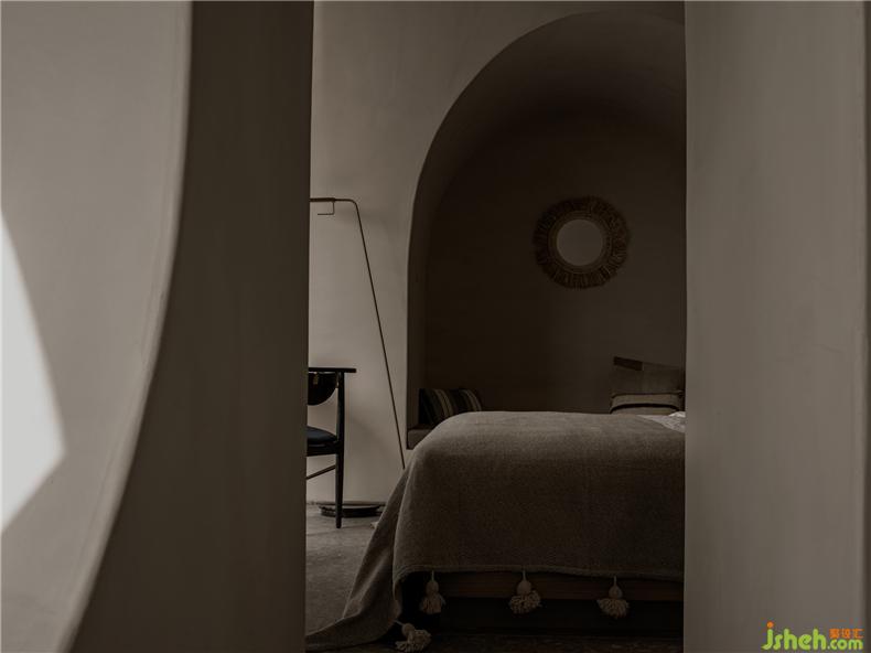 入門即是風景,大概是客人們對房間的最高評價了。設計師將玻璃窗大面積的置入室內,將自然闊景與光影詩意引入其中,形成建筑內外的互動對話。側目滿眼碧海,抬頭皆是星光,為整個房間增添了無窮盡的浪漫主義色彩。弧形的圓拱設計,營造出洞穴般的原始風情,同素凈的墻壁一起,展現出一種質樸的粗糲感。光影如海浪般在屋內起伏,勾勒著建筑的邊界與線條。民宿設計在強化了弧的張力的同時,延伸著曲面帶來的視覺廣度。