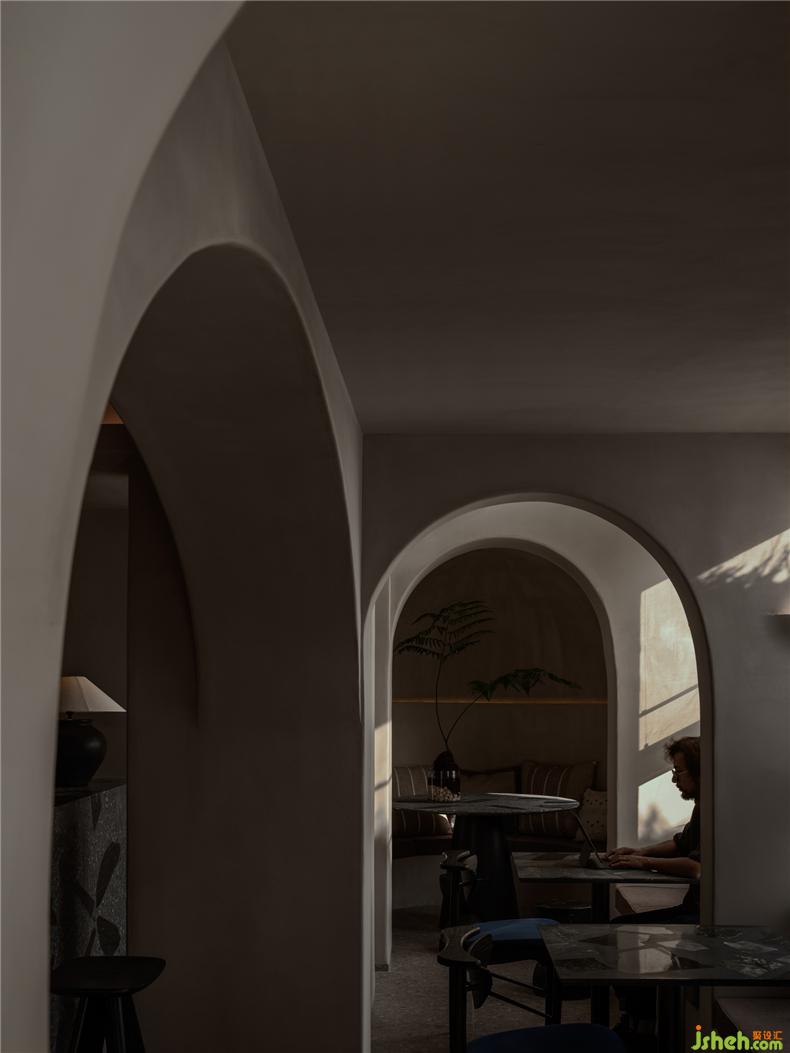 空間是人群的聚集,給予人類交互的可能性。設(shè)計(jì)師賦予空間以優(yōu)雅、嫻靜、民宿設(shè)計(jì)自然的大方,引導(dǎo)人們停頓、凝望、小憩、交流。玻璃嵌入屋頂,讓光影從空中輕盈流瀉,與側(cè)面躍入的光線層層交織,互相輝映,明亮了空間的視野,提升了人群交流互動(dòng)的可能性??v橫交錯(cuò)間生成形式上的變幻,感受明與暗的對(duì)比,以表達(dá)建筑的藝術(shù)哲學(xué),增加了空間的趣味性與生動(dòng)感。
