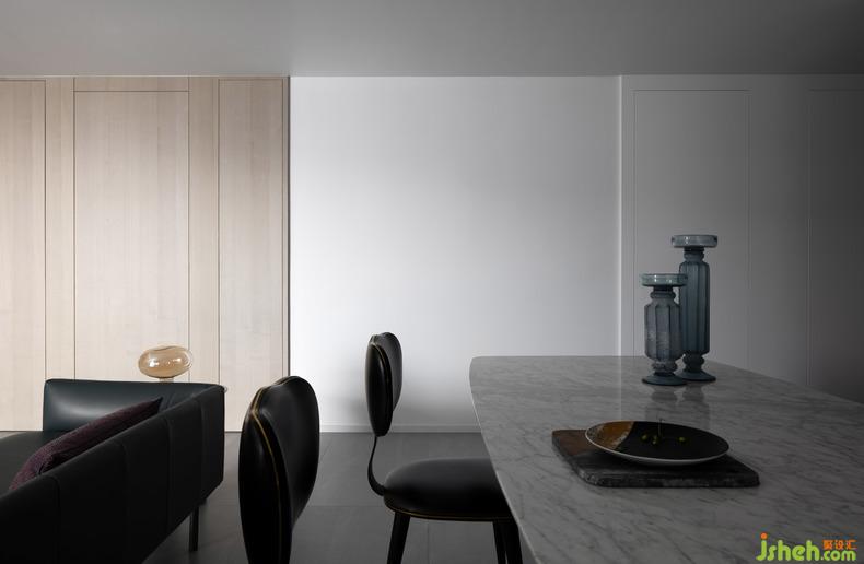 沙發(fā)背后的空間讓渡給了用餐區(qū),一張長(zhǎng)長(zhǎng)的大理石方桌,室內(nèi)設(shè)計(jì)師便足以承載一場(chǎng)大型的家庭聚會(huì)。餐桌上的陶瓷擺件,成為了素雅空間里的一抹亮色,為屋主的日常生活帶來(lái)了雅致的情趣。