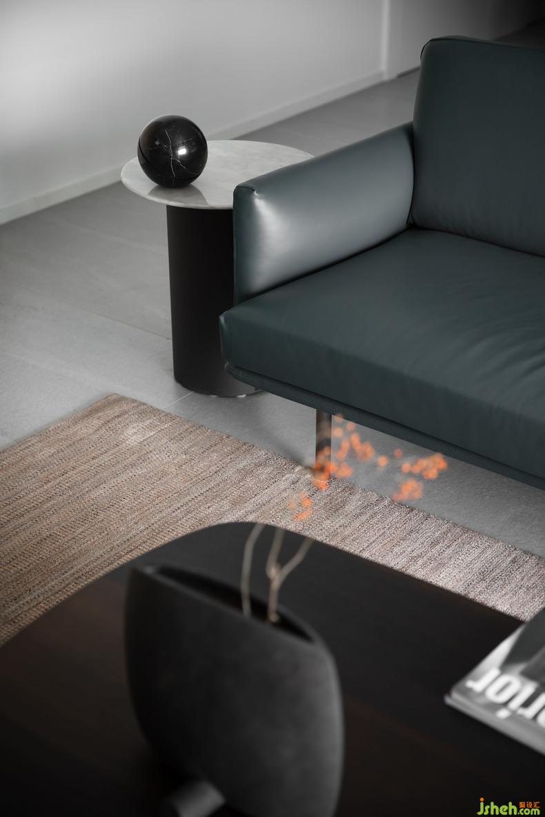 客廳是空間風(fēng)格展示的第一站,也是整個(gè)家庭裝修風(fēng)格的定調(diào)。室內(nèi)設(shè)計(jì)師為保留空間的簡(jiǎn)單優(yōu)雅,客廳并沒有放置過(guò)多的裝飾,銅銹綠的皮質(zhì)沙發(fā)安放于整個(gè)空間的正中線,與茶幾上的紅梅花藝相互呼應(yīng),在共作一副極具意境的紅梅映雪圖之時(shí),將客廳空間一分為二。