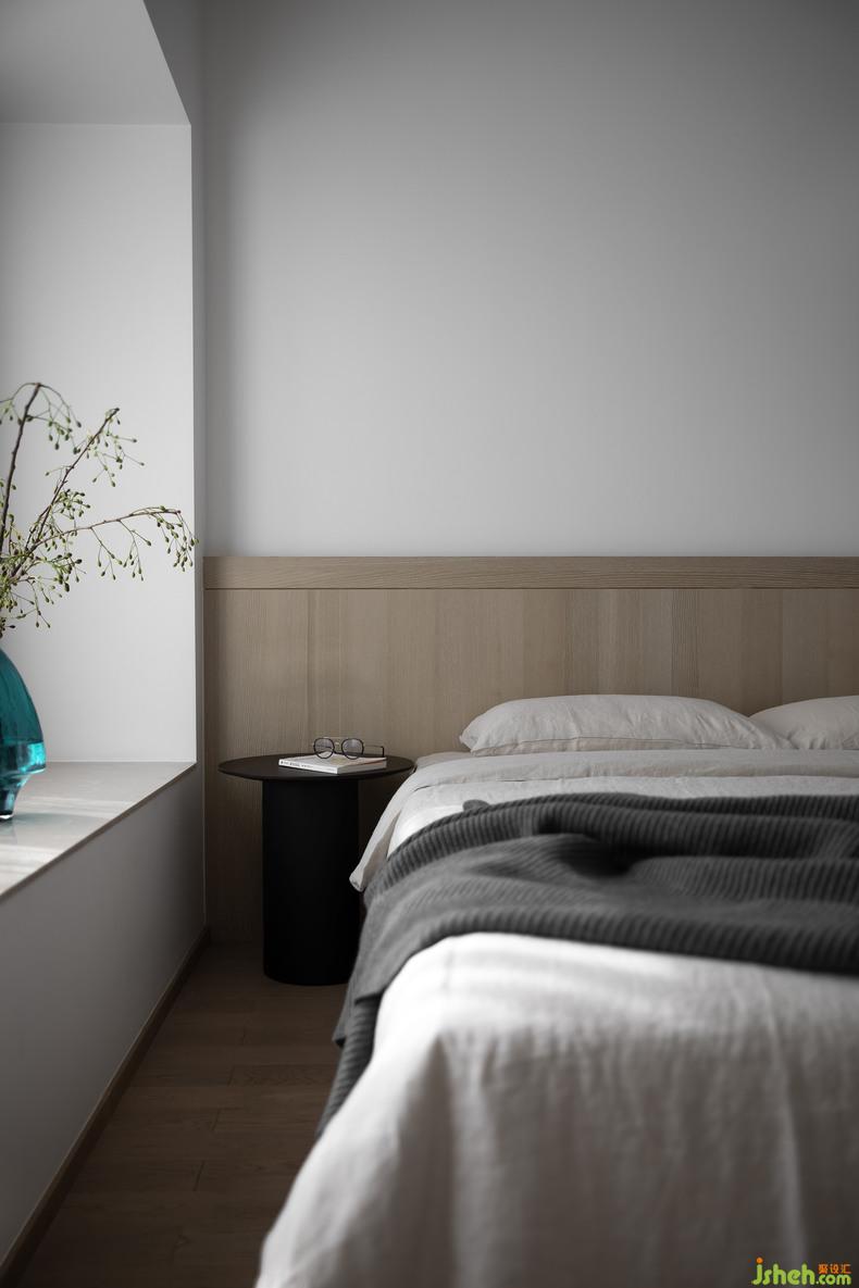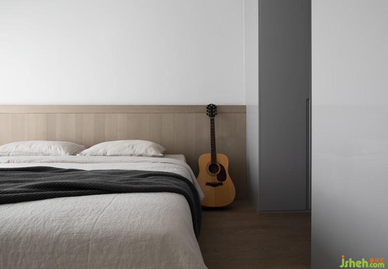 臥床的兩側(cè),一個黑色圓形木質(zhì)床頭桌,一把可以看得出使用年歲的吉他,室內(nèi)設(shè)計師便是所有的裝飾。書與音樂自帶著靜心的力量,創(chuàng)造著絕對放松的休憩空間,賦予生活柔和的深度與溫度。