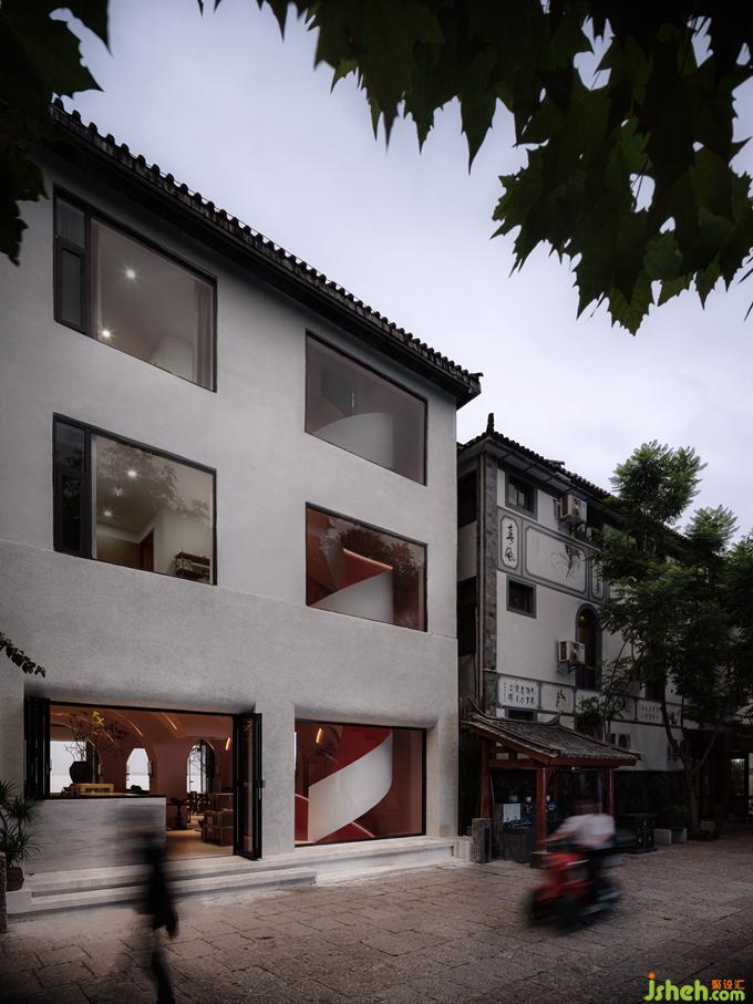 保留了白族建筑的飛檐翹角,蜚聲將整個建筑的外立面進(jìn)行了改造。整棟樓的外墻,由向內(nèi)的磚瓦的封閉,改為向外的玻璃的通透。在保留建筑形體與空間結(jié)構(gòu)的同時,使得人的視野得以貫穿整個空間,達(dá)成室外室內(nèi)再到室外的三重對話與互動。