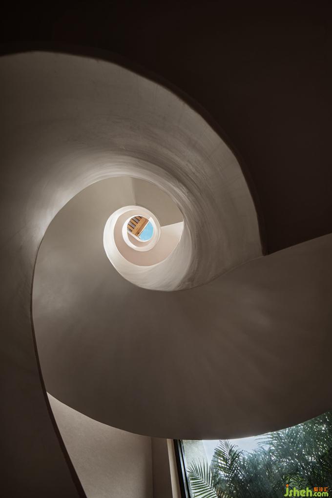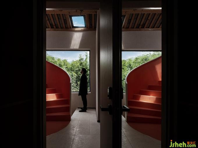 在光影的交織中,樓梯不斷地旋轉(zhuǎn)而上,好似空間的媒介一般,將功能完全不同的各個樓層串聯(lián)為整體。就像一棵從民宿里生長出來的樹一樣,陪伴著人群的流動,默默無言卻又充滿生命力,營造出不同于任何空間的獨(dú)特場域。