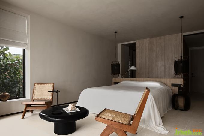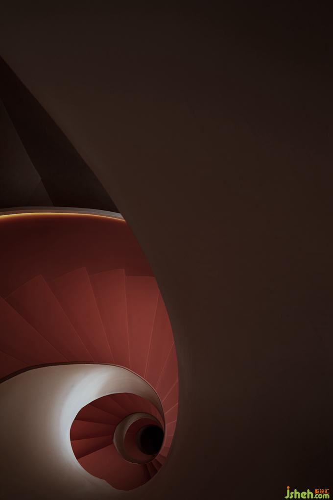 不同于外在的白色主色調(diào),樓梯內(nèi)裹的一抹朱色,為空間注入一分清新的亮度,帶來了年輕感與活力。卻又因添加的那一點(diǎn)樺色的沉淀,而多了一分克制的內(nèi)斂,將整個顏色的亮度下壓,達(dá)成了空間色系的平衡。酒店設(shè)計(jì)