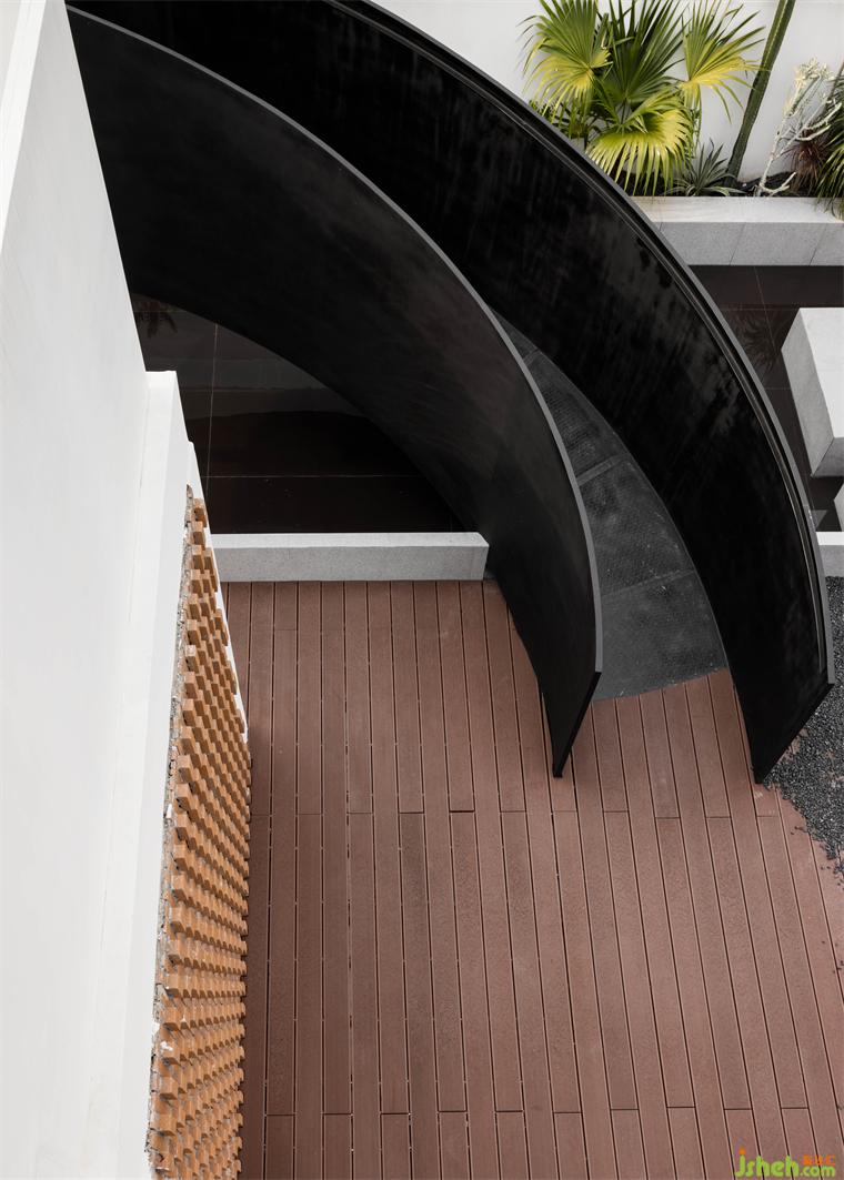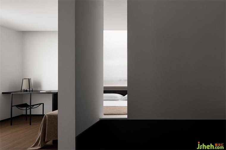 朝向陽光的奔赴是貫穿人類歷史的主題,不僅表現(xiàn)在于室內(nèi)的向外,酒店設(shè)計(jì)也同時(shí)存在于室外的向上。朝著陽光蜿蜒而上的黑色金屬梯,是陽光投射下流動(dòng)的影子。它承接一種直接的溫暖,也體悟一種恒久的寓意。