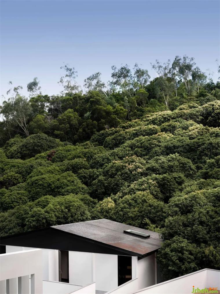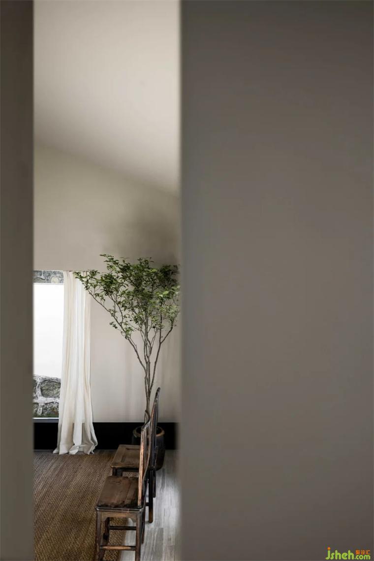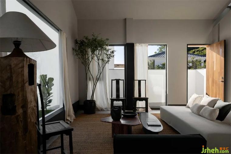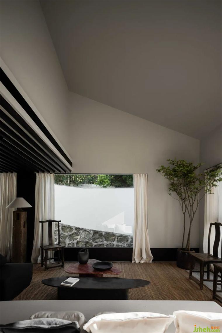 軟風(fēng)煙雨,青瓦飛檐;建筑和室內(nèi)空間皆以黑白為主色,對比鮮明,卻又能和諧相融。猶如一幅飄逸出塵的中國水墨,輕描淡寫幾筆,苫也不若林民宿設(shè)計(jì)卻能勾勒出大地山川、世間萬象,越簡單、越有韻味。猶如墨色的各類黑色材質(zhì),于空間的白色中擴(kuò)散開來,渲染出一幅令人更加安定、沉靜的氛圍。